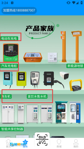 2、进入【服务】页面,浏览【产品家族】板块,查看【电动车充电】【汽车充电桩】【洗车机】【直饮水售水机】等产品的详细信息,根据自身需求选择并使用对应的服务。