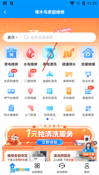 1、于首页找到并点击【上门维修】功能入口,随即进入对应的服务页面。