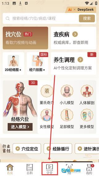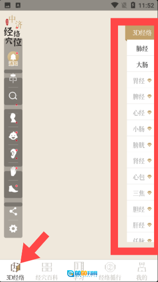 2、首页点击,左下角【3D经络】可以查看各种部位