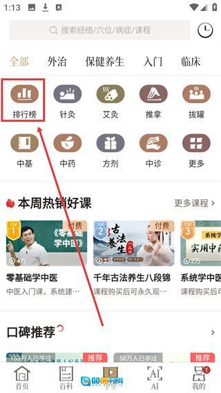 2、进入学堂页面后,找到并点击【排行榜】选项,即可进入课程排行榜页面,查看热门课程榜单。