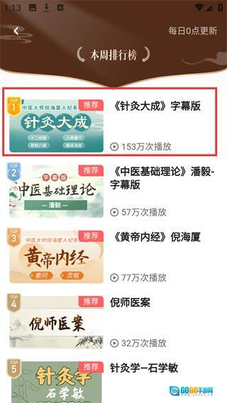 3、在课程排行榜里,找到【《针灸大成》字幕版】这门课程,点击它就能进入课程页面。