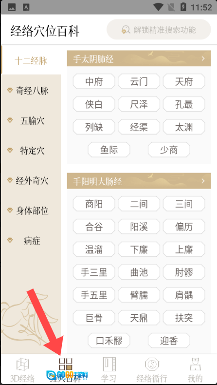 3、点击下方【经穴百科】可以查看人体各种经脉穴位