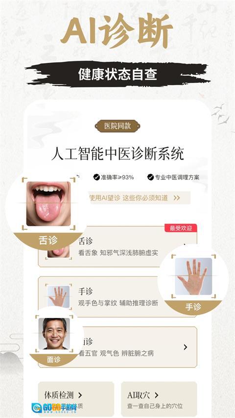 4、智能健康分析:借助人工智能技术,用户上传舌面照片后,系统可对舌体情况进行分析,从而辅助判断健康状态,并给出病症调理的相关方案。