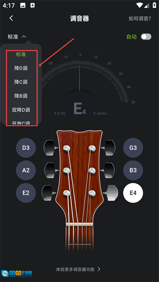 3、可选择【降D调】【开放A2调】等不同的调音模式。