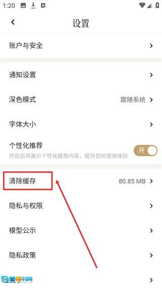 3、在设置页面中,找到【清除缓存】选项,点击该选项可触发缓存清理确认弹窗。