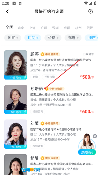 1、汇聚众多资深心理咨询师,每位咨询师均详细展示职业经历、擅长领域、价格等信息。