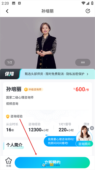 4、查看其资质、咨询经验等信息,点击底部的【立即预约】按钮,发起咨询预约。