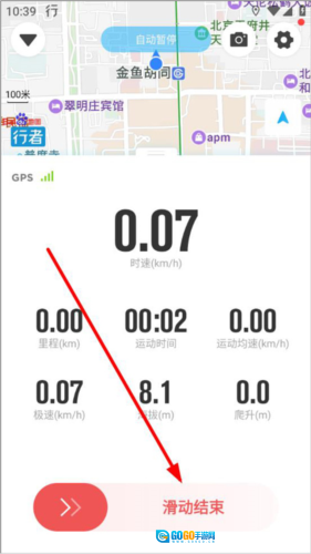 3、运动结束后,可看到运动速度、时间、海拔等,点击滑动结束键即可结束并查看运动记录