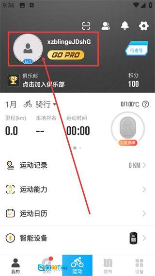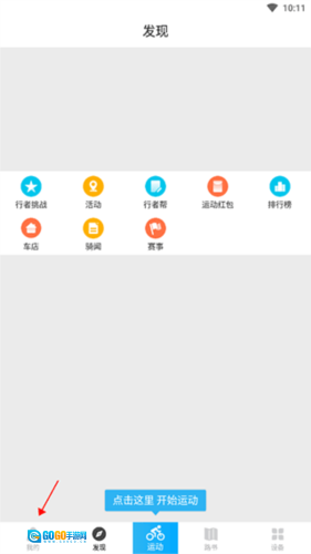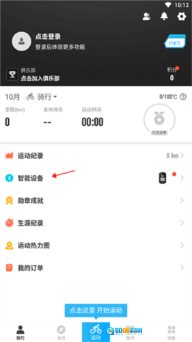 1、打开行者骑行,登录进入主页,可查看运动记录、连接智能设备、查看勋章、生涯纪录等,点击"运动"