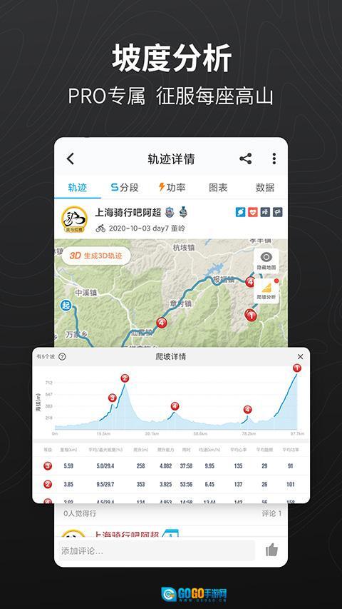 2、记录运动轨迹、功率数据、连接码表心率踏频、海拔曲线、坡度评级、找户外路线、导航、组队、线上赛、勋章成就等超多实用的功能!
