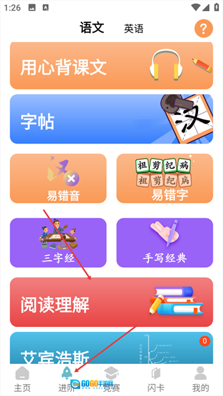 1、在【进阶】页面,找到【阅读理解】选项并点击。