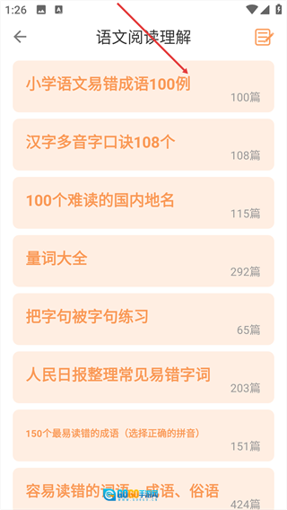 2、进入阅读理解页面,选定【小学语文易错成语100例】选项。