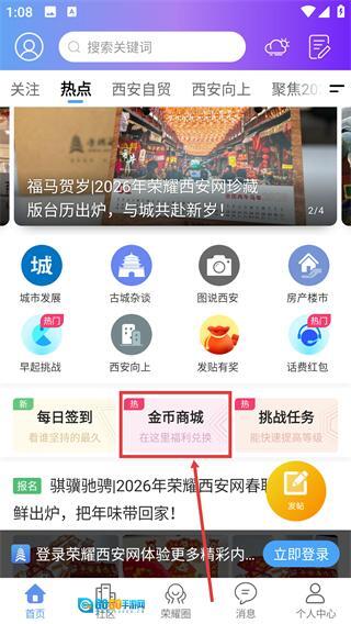 1、进入首页后,找到并点击【金币商城】的入口,即可进入该板块进行福利兑换等相关操作。