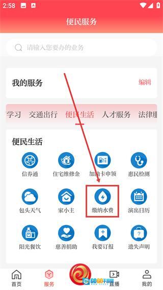 3、在【便民生活】分类下,找到【缴纳水费】功能入口并点击,可进入对应的水费缴纳相关页面。