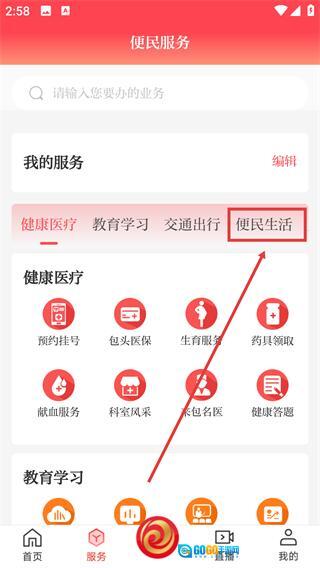 2、进入【便民服务】页面后,点击分类栏里的【便民生活】选项,可切换到对应类别的服务功能列表。