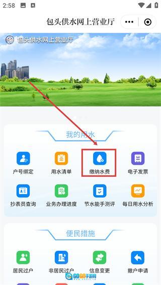 4、进入【包头供水网上营业厅】页面,在【我的用水】板块中点击【缴纳水费】,即可进行水费缴纳操作。
