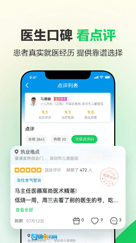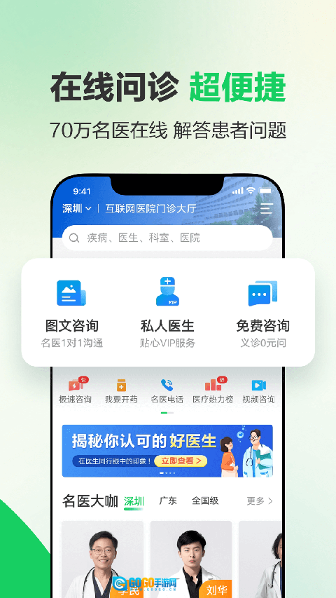 2、满足多样的健康需求:在线挂号覆盖深圳儿童医院、香港大学深圳医院等数千家三甲医院,可预约号源超200万;医生咨询支持50多万医生7*24小时在线,提供图文/电话/视频咨询,10分钟内快速响应;私人医生提供长期咨询、手术管理等服务,实现足不出户看名医;健康课堂邀请专家名医直播,传播健康科普知识;在线购药涵盖常用药、专科药、中药,在线付款便捷省心;健康商城包含保健品、医疗器械、HPV疫苗等品类,网购健康更便捷。