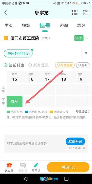 4、选择医生及挂号时间,注意页面顶部的放号公告(下图红色箭头标注),关注放号时间。
