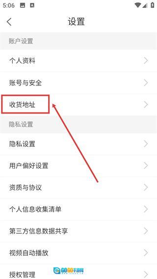 3、进入【设置】页面后,找到【收货地址】选项并点击,可进入对应的地址管理页面。
