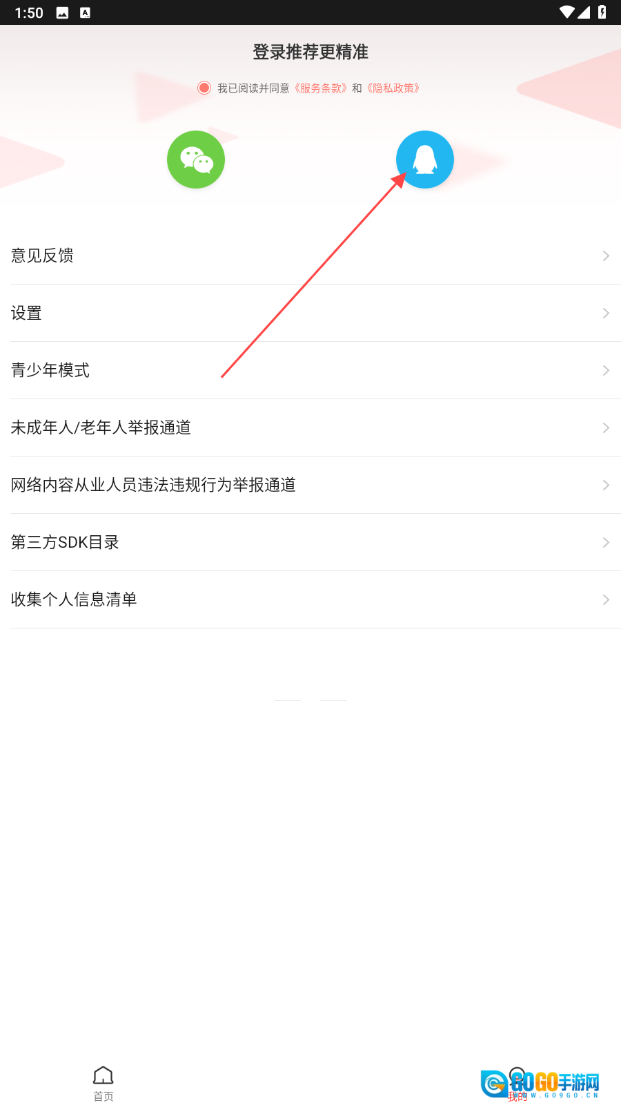 3、在个人中心勾选协议后点击【QQ】进行登录。