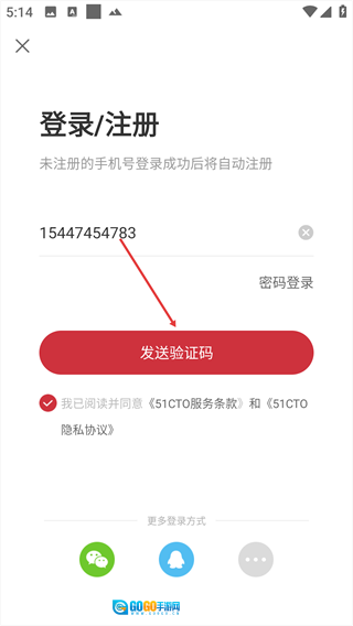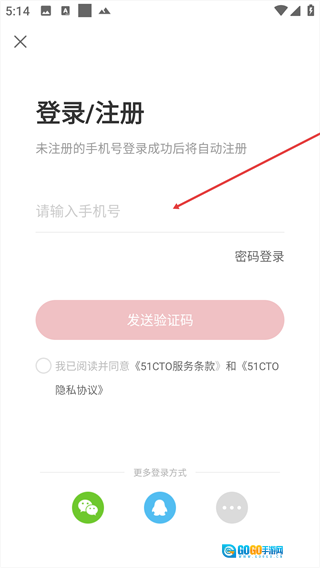 2、进入登录/注册页面后,在【请输入手机号】输入框中填写对应的手机号码。