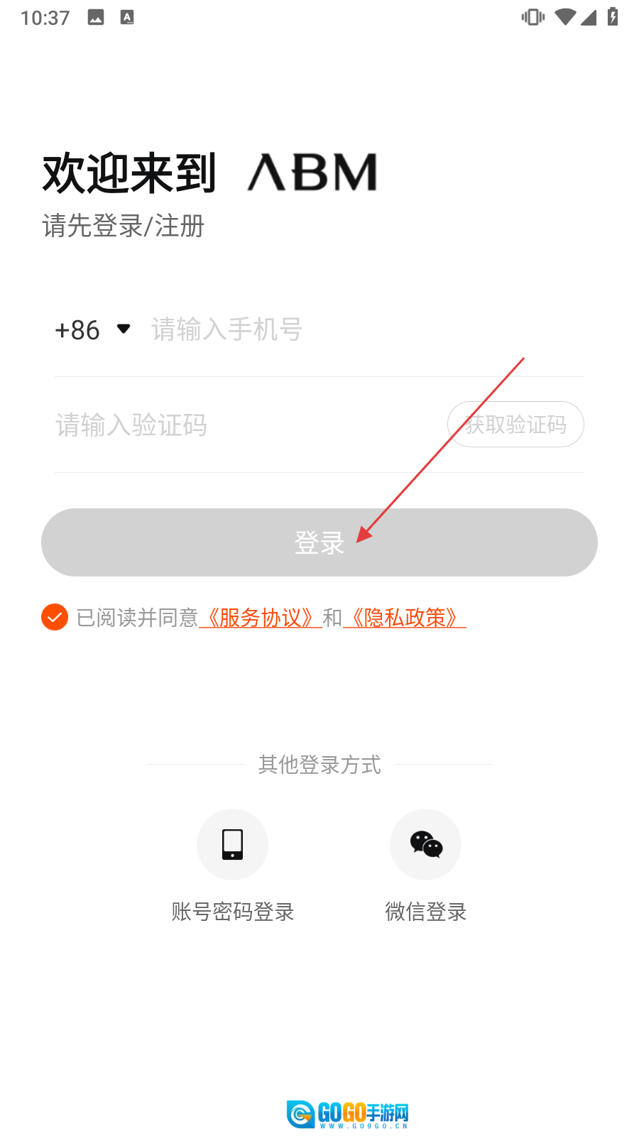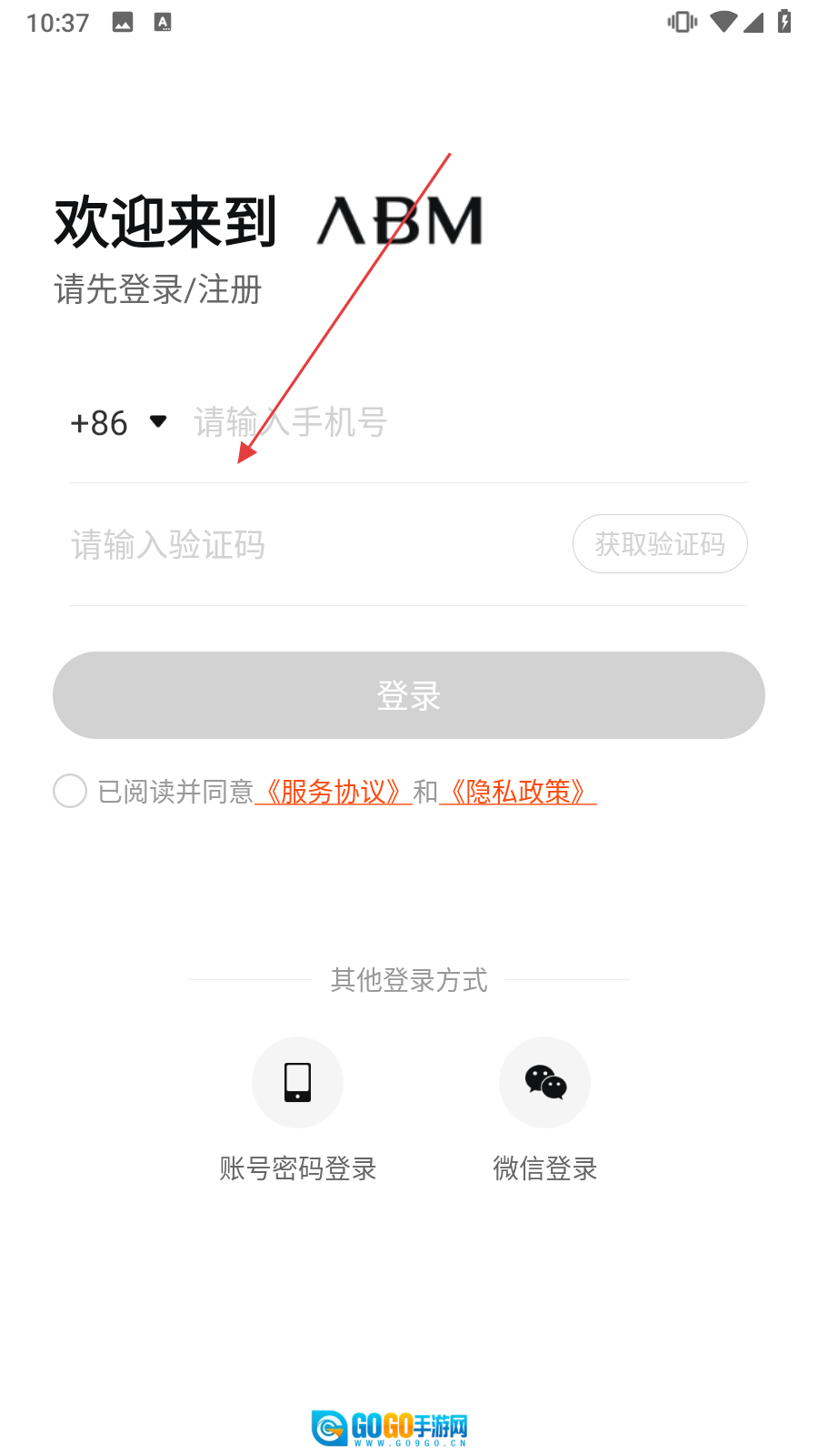 1、打开ABM,进入登录/注册页面。在【请输入手机号】栏输入手机号。
