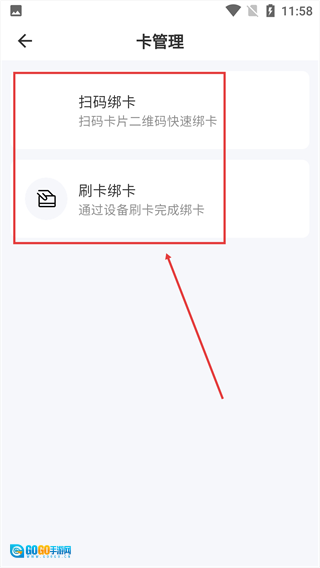 4、弹出绑卡方式选择界面后,可选择扫码绑卡或刷卡绑卡这两种方式,进而完成云卡的绑定操作。