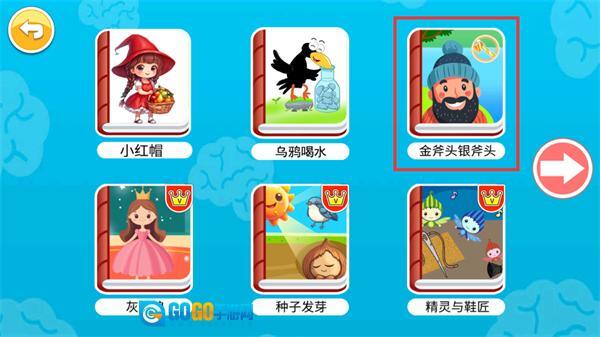 3、在绘本选择页面,选择【金斧头银斧头】绘本,点击即可进入该绘本的具体学习界面。