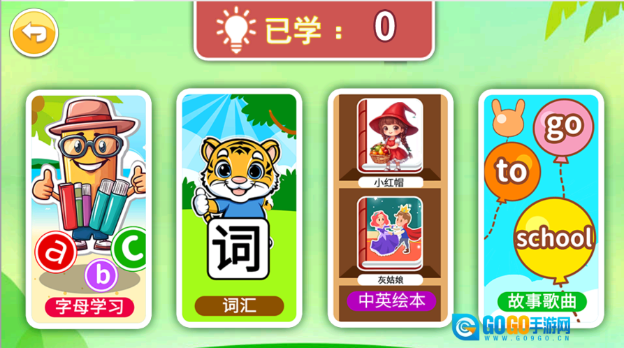 2、在学习内容界面,查看字母学习、词汇、中英绘本等可点选的分类内容。