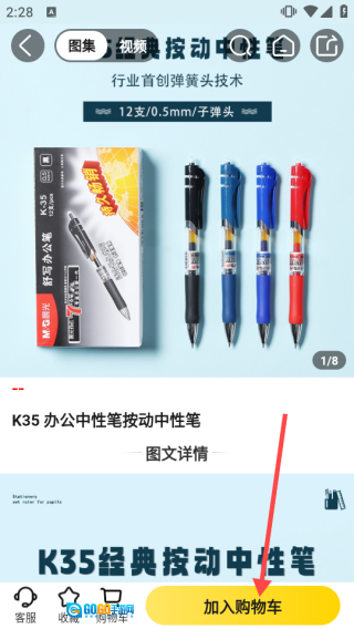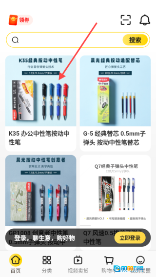 1、打开软件,在首页通过搜索栏搜索或直接浏览找到心仪商品,如【K35办公中性笔按动中性笔】。
