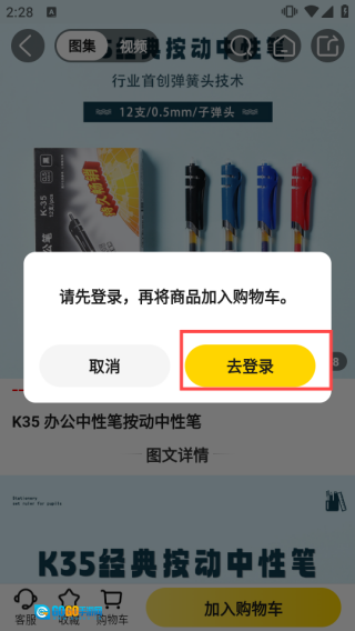 3、若未登录,弹出提示框后,点击【去登录】,完成登录后再将商品加入购物车即可购买。