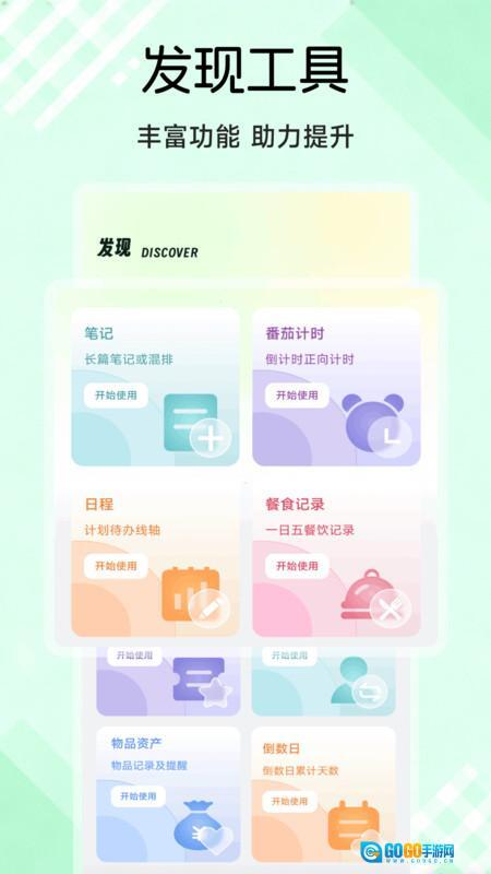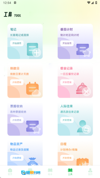 4、工具页面集成了笔记、番茄计时、倒数日、餐食记录、票据收纳等多种实用功能。