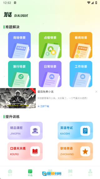 2、对话页面涵盖商场、点餐、看病等多种情景,同时设有精品课程、口语天天练等提升类训练内容。