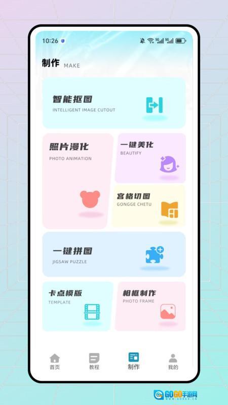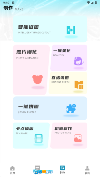 4、制作页面具备图片漫化、一键美化、宫格切图、一键拼图、卡点模板以及相框制作等功能。