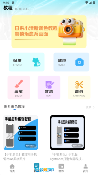 3、教程页面包含贴纸、滤镜、画笔、文本、裁剪以及图片调色相关教程。