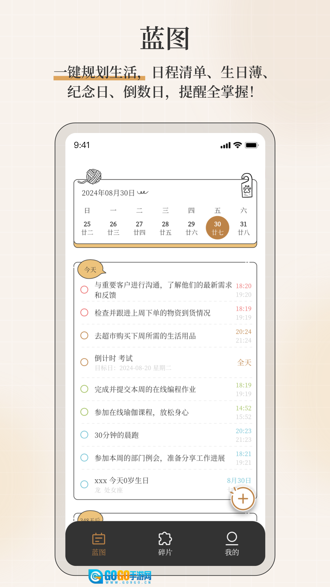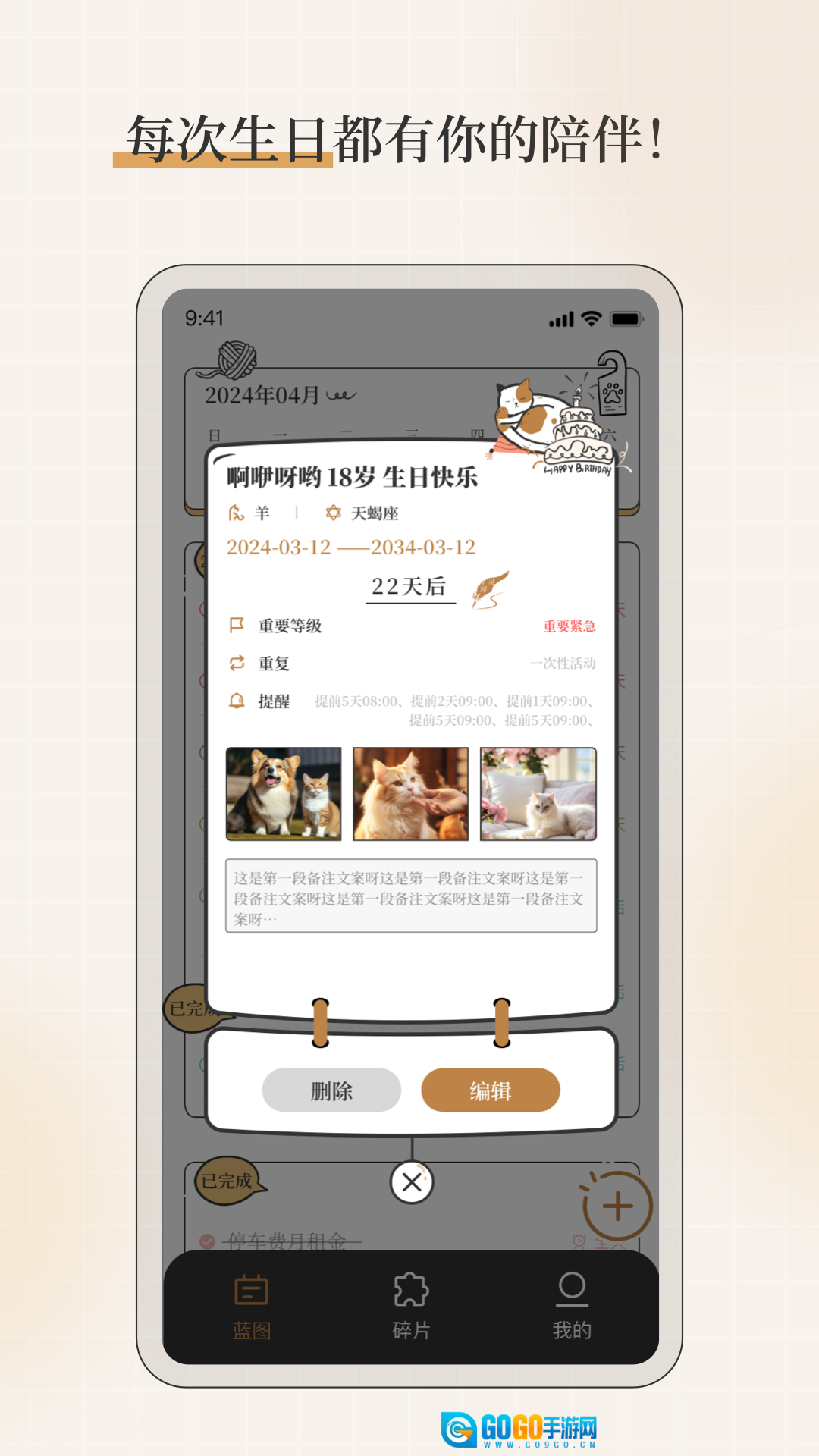 2、全能提醒系统:不忘星球融合了日程提醒、待办清单、生日记录、倒数日和纪念日提醒等多维度的提醒服务。不管您是投身于工作里的关键任务,还是沉浸在生活中的美好时刻,不忘星球都会按时发出提醒,保证您不会遗漏任何重要的事情。