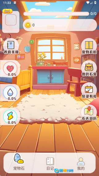 1、打开软件后,在首页就能看到养宠物的场景,接着点击宠物石进入登录页面;