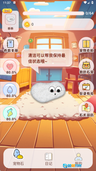 4、首次登录成功可领取奖励,进入主页面后,你可以清洁自己的宠物石,还能了解它的养育方法。
