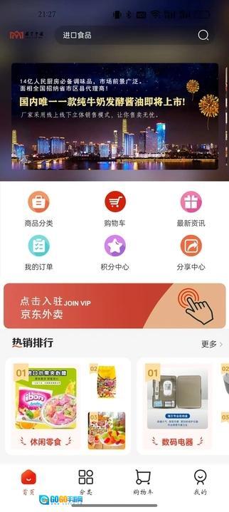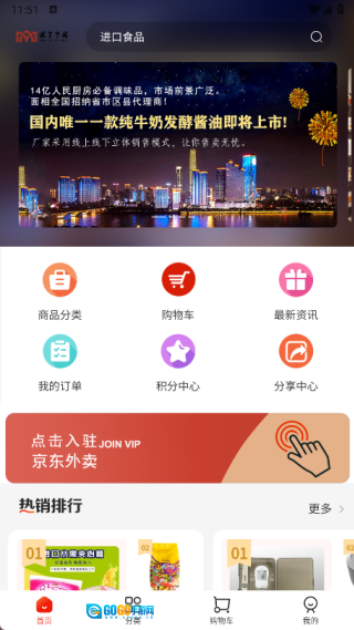 1、首页设有商品分类、购物车、最新资讯、我的订单、积分中心、分享中心等版块,包含热销排行内容,并且支持京东外卖入驻。
