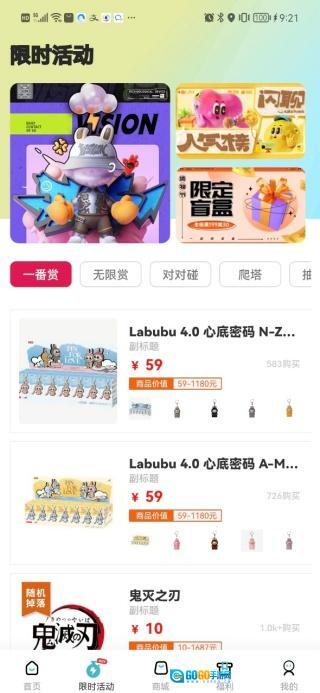 2、限时活动页面包含一番赏、无限赏、对对碰、爬塔等多个不同版块。