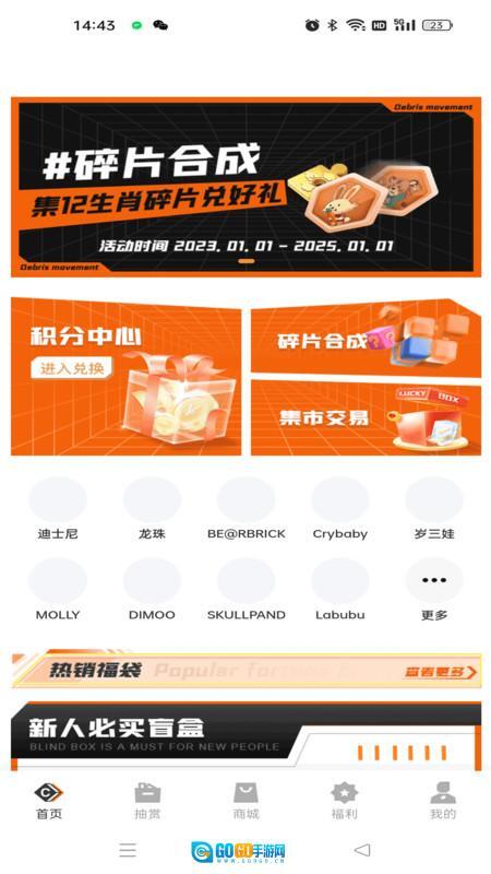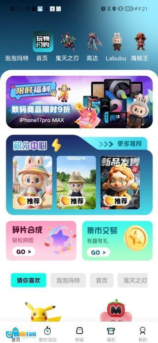首页设有积分中心,集成了碎片合成、集市交易功能,同时提供数码商品限时9折的抢购活动。