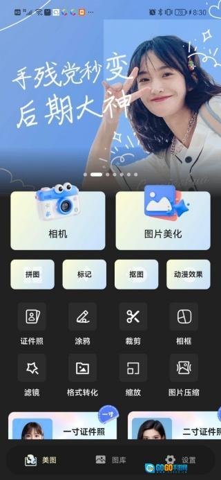 1、美图页面里包含相机、图片美化、拼图、标记、抠图、动漫效果、证件照等各类功能;