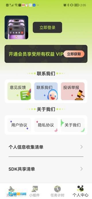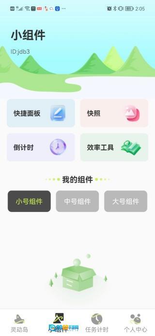 2、小组件页面包含快捷面板、快照、倒计时、效率工具,此外还展示了我的组件信息。