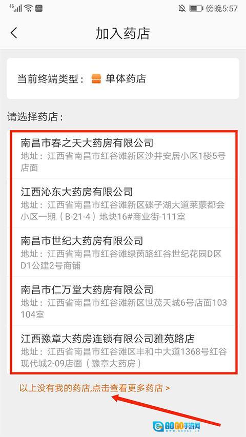 3、可在列表中出现附近的药店名称进行查找或者选择下方“以上没有我的药店,点击查看更多药店”选项,