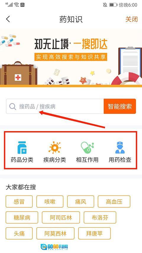 2、进入药知识界面,可根据需求选择“药品分类”、“疾病分类”、“相互作用”和“用药检查”查询,也可以在“搜索框”搜药品或者搜疾病进行查询,