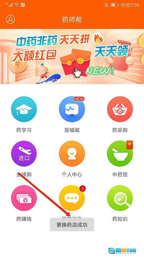 6、返回应用主页,可看到“更换药店成功”提示,已成功加入药店了。
