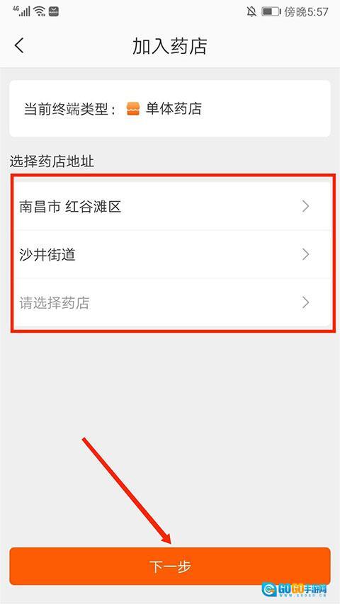 4、在确认好药店的地址与名称后,点击下方的“下一步”按钮。