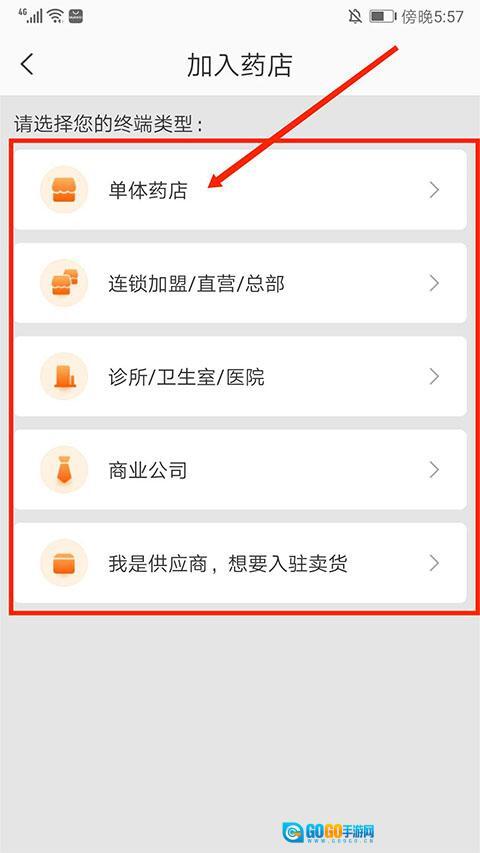 2、进入药店类型界面后,选择对应的类型就行,这里我们以“单体药店”作为示例。