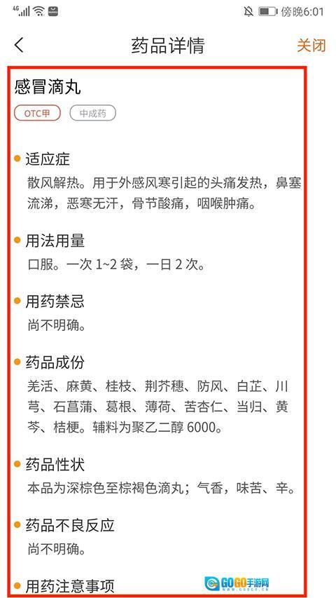 4、进入药品详情后,可看到“适应症”、“用法用量”、“用药禁忌”、“药品成份”、“药品性状”和“药品不良反应”等内容。