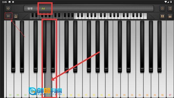 1、在钢琴界面,点击对应【A4】的琴键,同时能借助左侧按钮调节音量,完成该音符的弹奏。